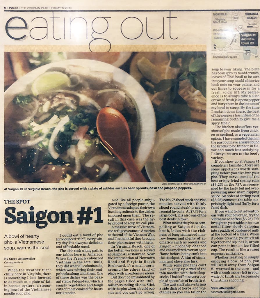 Saigon 1 serves a variety of Vietnamese cuisine such as Cha Gio (Crispy Rolls), Beef Pho, and Com Tam Suon (Rice with Grilled Pork). We're not far from Witchduck Lake and Sentara Leigh Hospital. Order online for carryout or delivery!